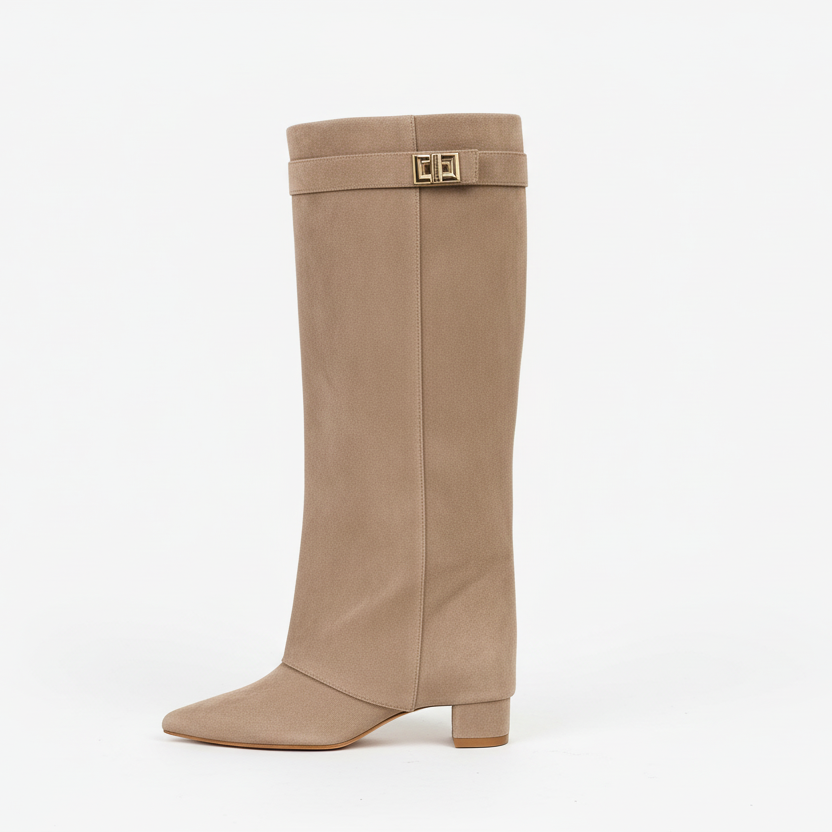 Bota alta confeccionada en piel sintética efecto ante en tono beige. El diseño limpio y estructurado se realza con una tira decorativa con hebilla metálica en la parte superior de la caña, aportando un toque elegante y sofisticado. La punta afilada y el tacón medio crean una silueta estilizada y cómoda, pensada para acompañar tanto looks de día como de noche.