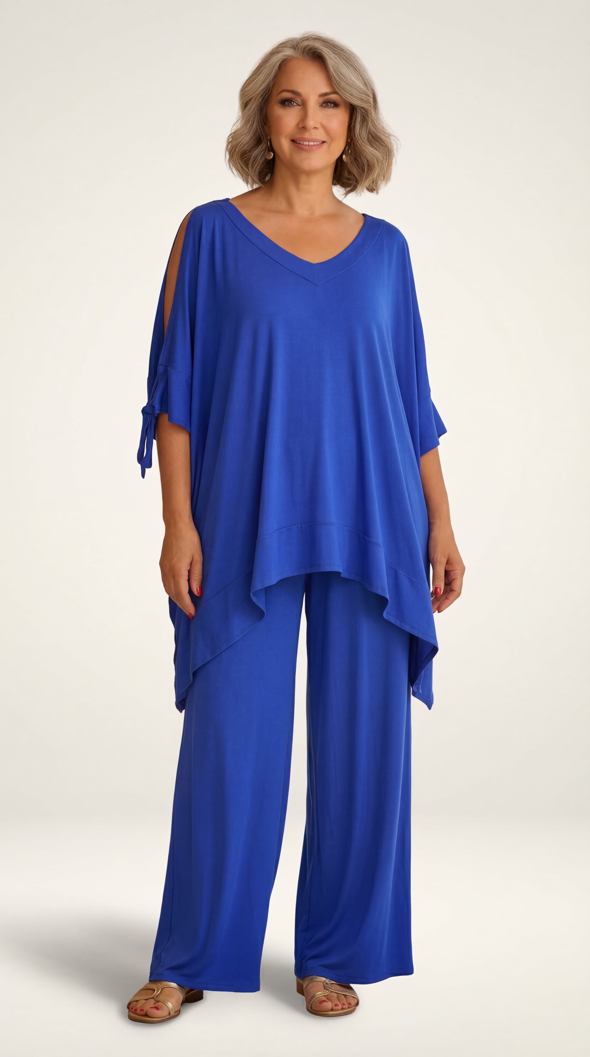 Las aberturas en los hombros, adornadas con delicados detalles anudados, aportan un toque moderno y sofisticado al clásico top de mangas amplias. Este conjunto versátil permite múltiples combinaciones: puedes llevarlo completo para un look armonioso o combinar cada pieza con otras prendas de tu armario.